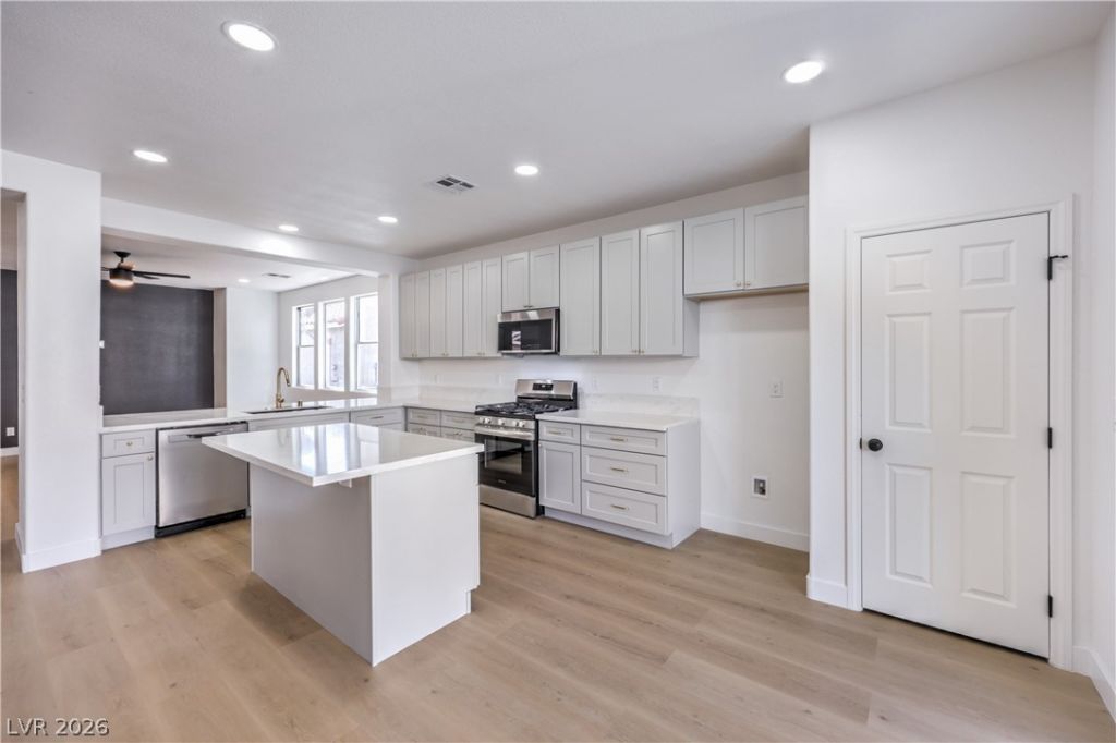 Beautifully remodeled two-story energy-efficient home featuring paid-off solar, a versatile upstairs loft, and a spacious backyard with an attached covered patio, located in the desirable Tierra Linda community. Conveniently situated with quick access to I-15 and Saint Rose Parkway. Inside, the home is filled with natural light and showcases a painted accent wall in the living area, ceiling fans, recessed lighting, custom light fixtures, plush carpet, and laminate wood flooring throughout. The upgraded kitchen offers a breakfast bar, shaker cabinets, custom countertops with gold hardware, a pantry, stainless steel appliances, and a center island with seating. Spa-inspired bathrooms have been fully remodeled and feature dual custom vanities with framed mirrors, modern lighting, beautifully tiled showers with rainfall shower heads, and built-in niches. Move-in ready.